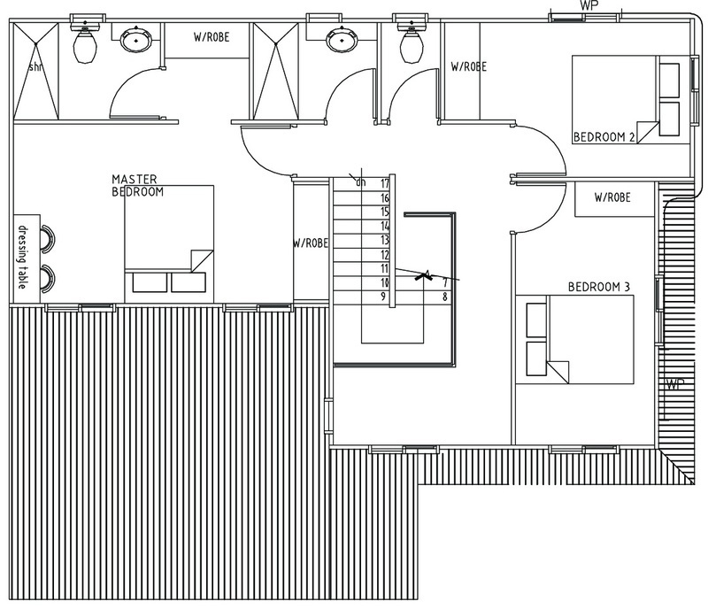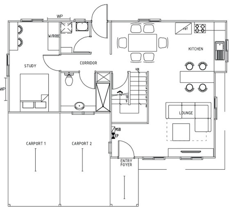 Additional structures consist of two storage compartments along the corridor (under the staircase/near the extra room), toilet and shower and an extra room at the far end. This room is easily transformed into either a bedroom or a study room.